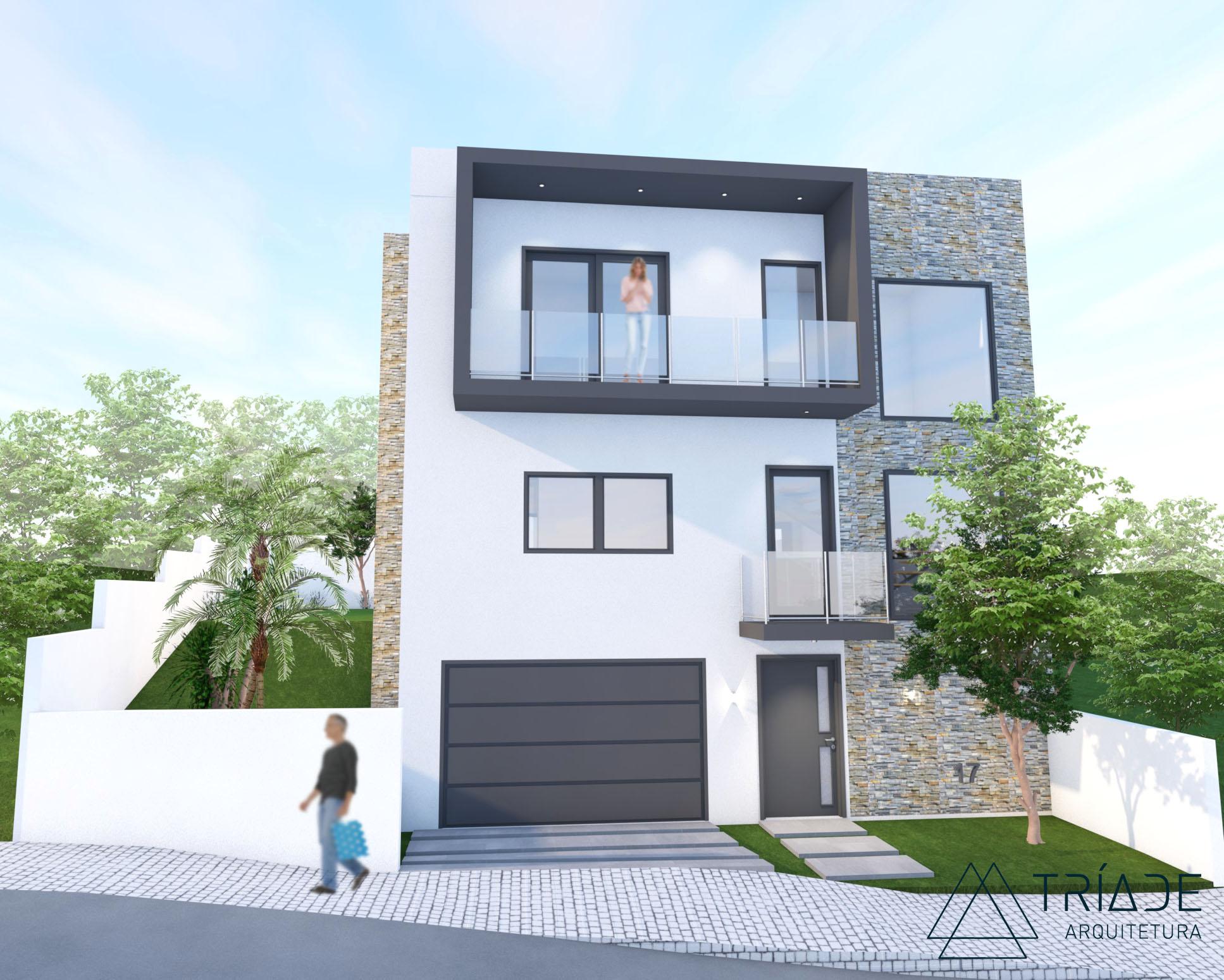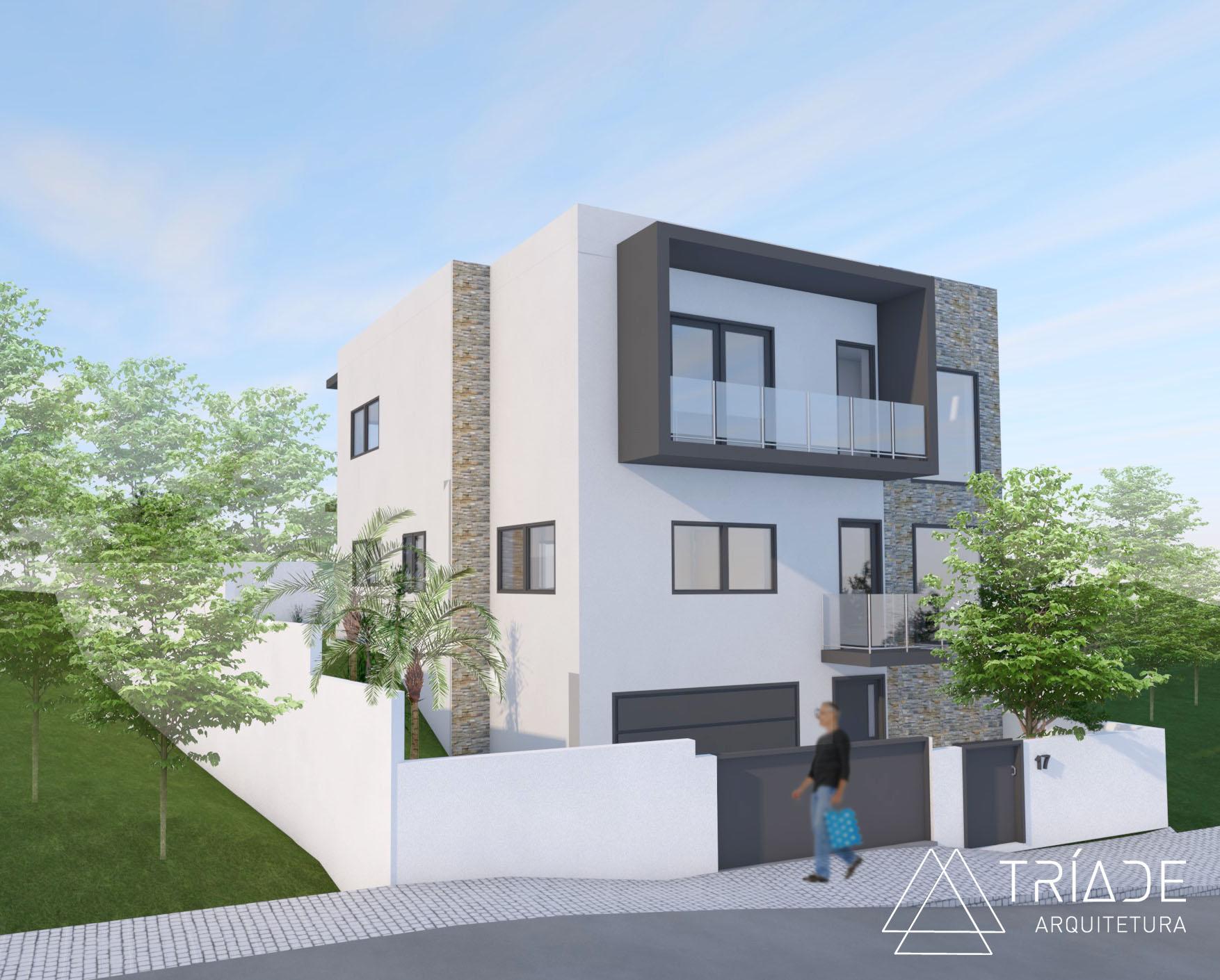 Projeto de Moradia de raiz T3 de linhas direitas e linguagem moderna, com cores neutras e materiais naturais na fachada, que foi projetada para ser construída em LSF.