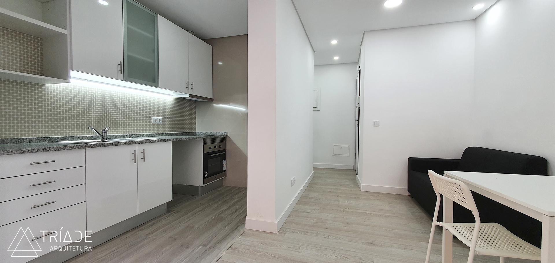 Este projeto de remodelação total de um apartamento T1 e logradouro tinha como objetivo tornar a casa mais funcional e otimizar os espaços ao máximo, considerando a importância da arrumação num espaço tão pequeno. O resultado passou pela criação de um open space entre a sala e a cozinha, dando uma maior leveza ao apartamento.