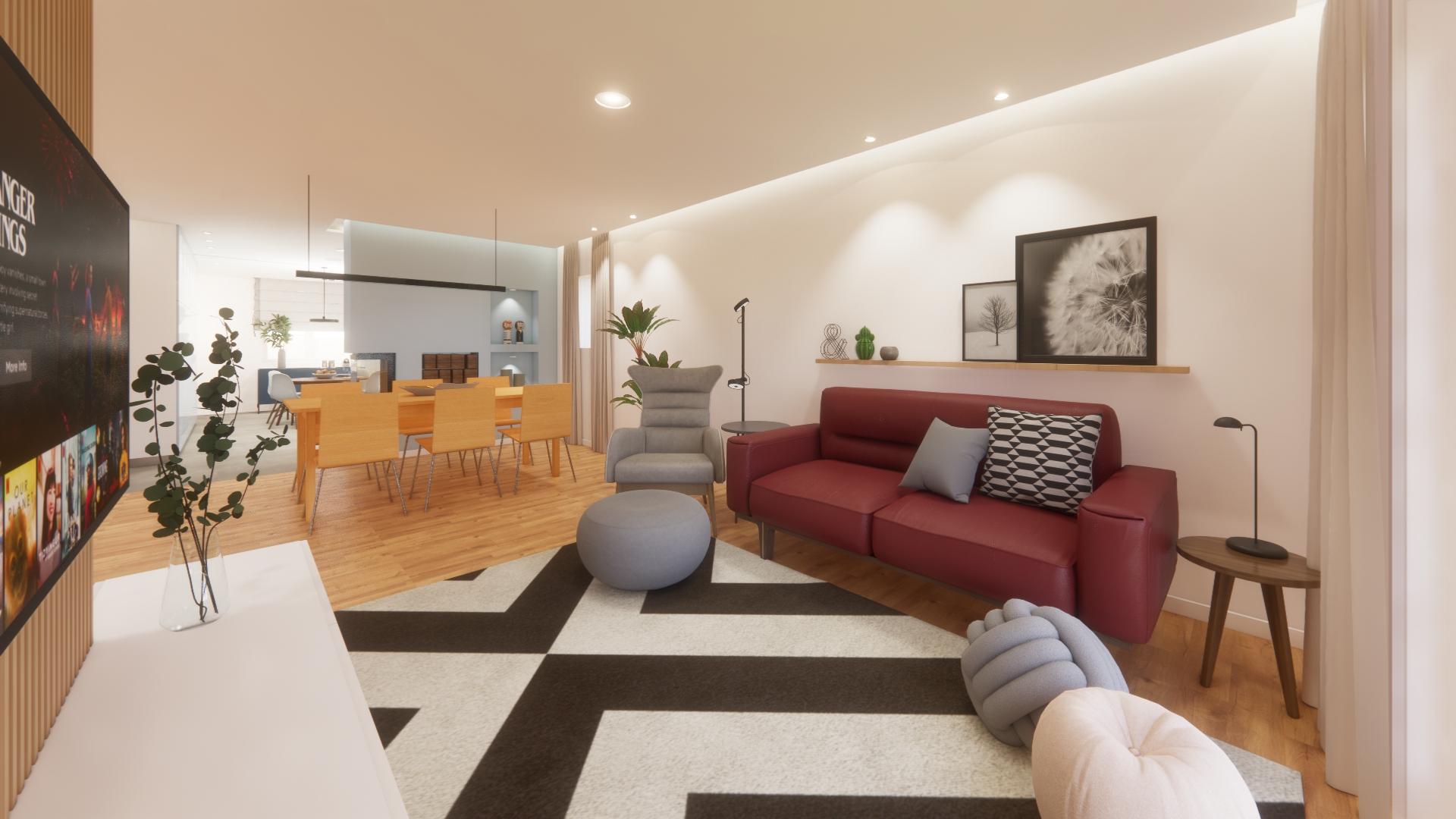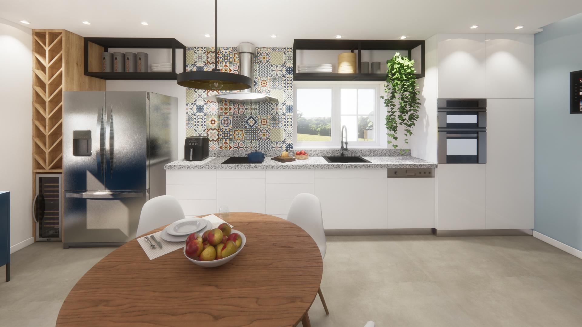 Remodelação de zona de cozinha, sala e wc suite. Nesta moradia com a demolição da zona que separava a sala da cozinha, obtivemos um espaço amplo e cheio de luminosidade, dando espaço para um open space onde se delimitaram as zonas de cozinha, zona de refeições e zona de estar.